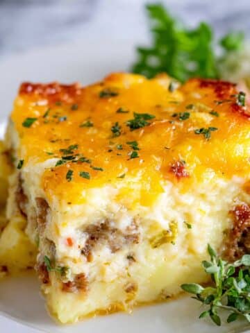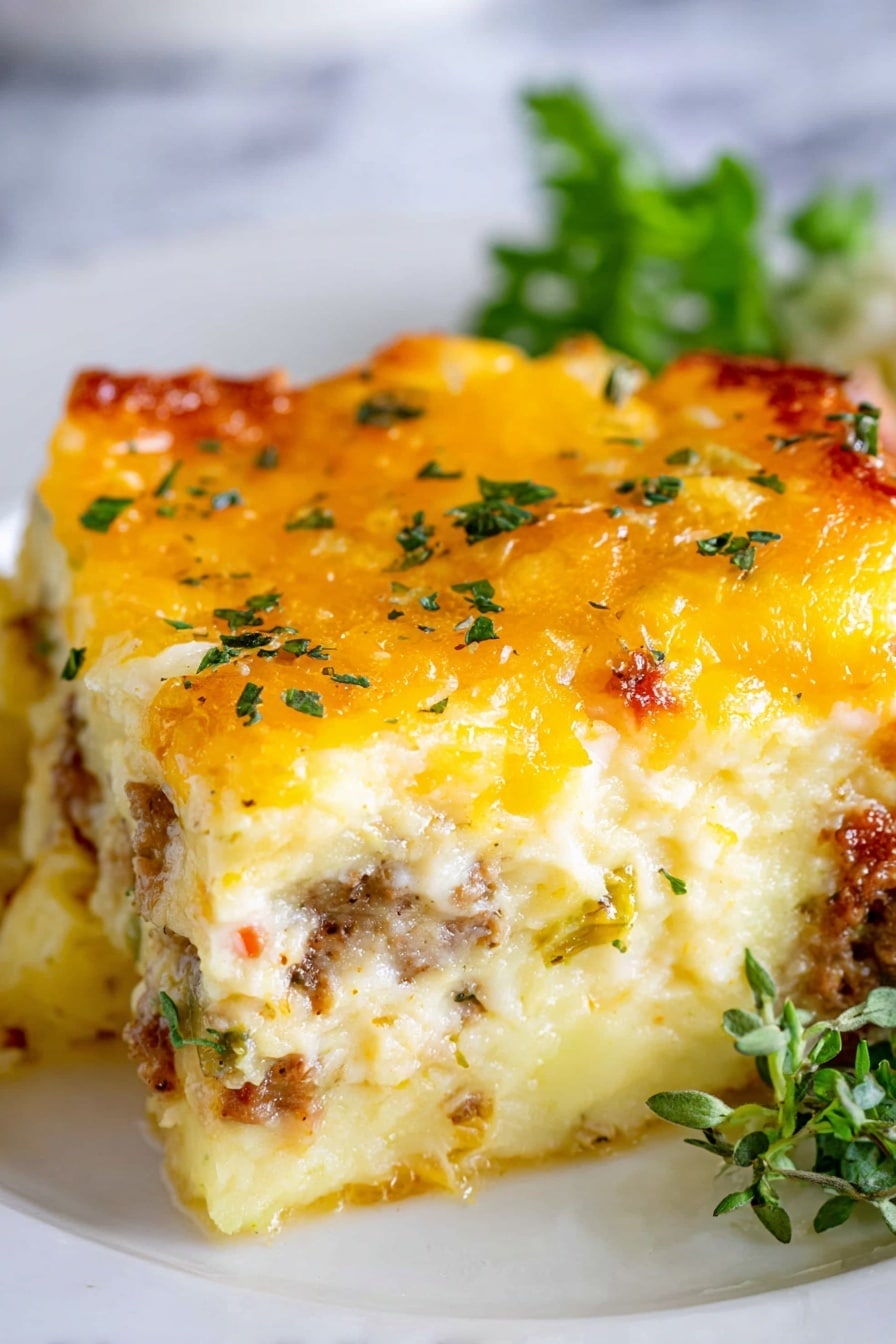 This bake freezes well, especially if you cut it into individual portions first. Wrap pieces tightly with plastic wrap and foil or place in freezer-safe bags. Thaw overnight in the fridge before reheating to ensure even warming without sogginess.