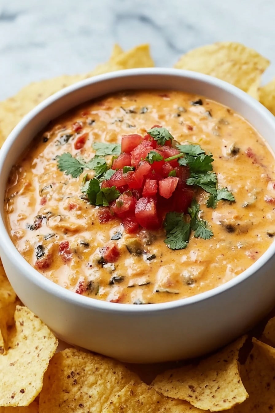 This Irresistible Rotel Dip is a creamy, cheesy comfort food that combines seasoned ground beef, Velveeta cheese, and flavorful Rotel tomatoes, topped with fresh garnishes. Perfect for parties or casual snacking, served hot with crunchy corn tortilla chips.