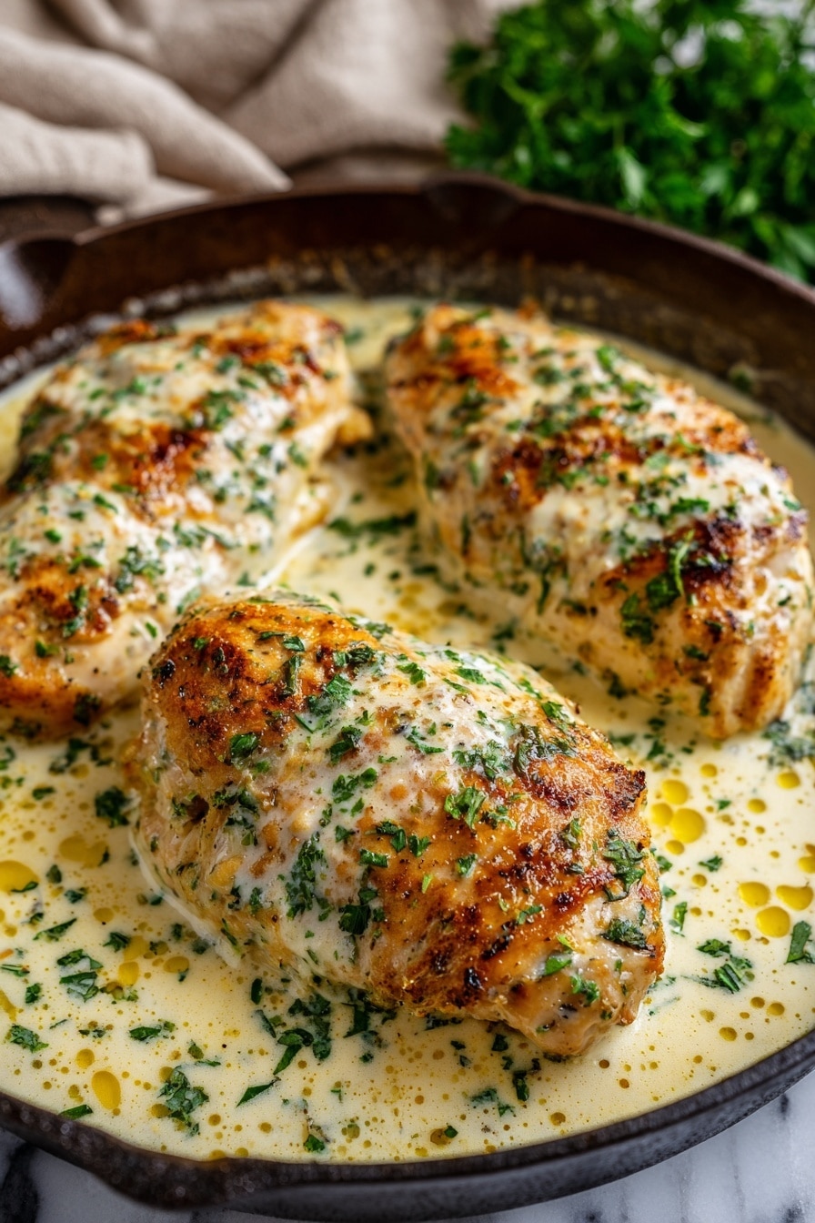 Serve the chicken breasts with a slight overlap to show off the golden topping. Scatter fresh herbs on and around the plate for color contrast. Build a gentle mound of mashed potatoes or a vegetable medley beside it for height. To capture that irresistible look in photos, shoot while the cheese is still melty and add a touch of natural light to highlight the glossy, rich textures.