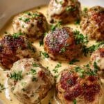 These Chicken Cordon Bleu Meatballs combine tender ground chicken, savory ham, and melted Swiss cheese, all coated in a crispy breadcrumb crust. Pan-seared to golden perfection and finished in the oven, they're served with a rich and creamy Dijon cream sauce that adds an elegant touch to this comforting dish.