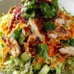 Chinois Chicken Salad is a vibrant and flavorful dish featuring tender chicken breast, crunchy Napa cabbage, toasted almonds, sesame seeds, and mandarin oranges, all tossed in a creamy Asian-inspired dressing. This easy-to-make recipe combines fresh vegetables, protein, and a tangy-sweet dressing for a satisfying and healthy meal perfect for lunch or dinner.