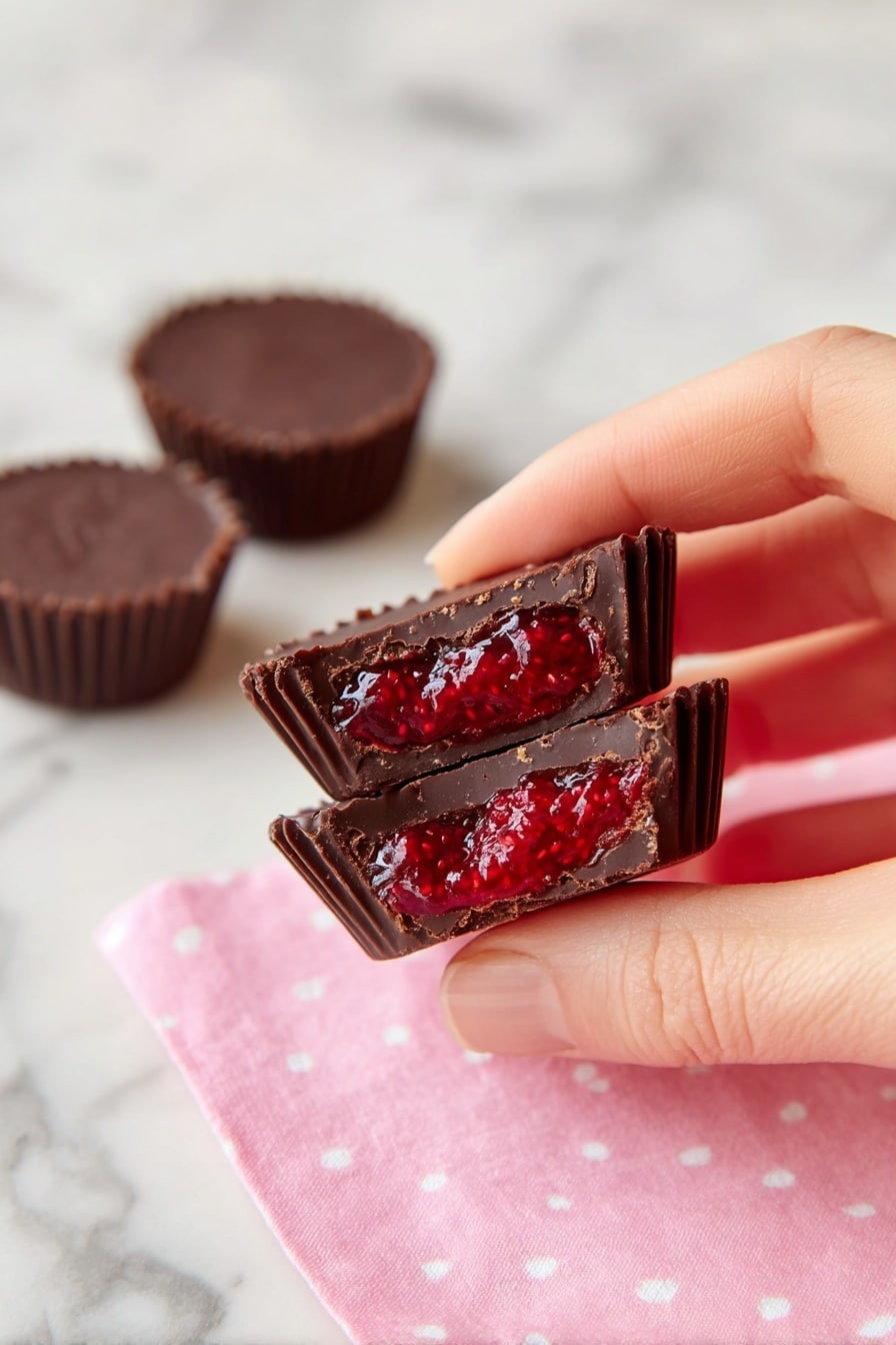 Use a shallow plate with a clean white or soft pastel background to make the deep chocolate and bright raspberry hues pop. Build a little height by stacking cups or pile fresh berries around. Wipe edges clean to keep the presentation crisp. For photography, natural light from the side brings out the creamy sheen of the chocolate and the jewel-like shimmer of the raspberry filling beautifully.