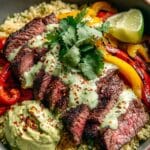 This Cilantro Lime Steak Cauliflower Rice Bowl is a fresh, low-carb dinner option that combines juicy marinated steak with flavorful cauliflower rice and vibrant toppings like avocado, red onion, and bell pepper. Finished with a tangy lime crema, it's perfect for a quick, nutritious meal.