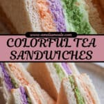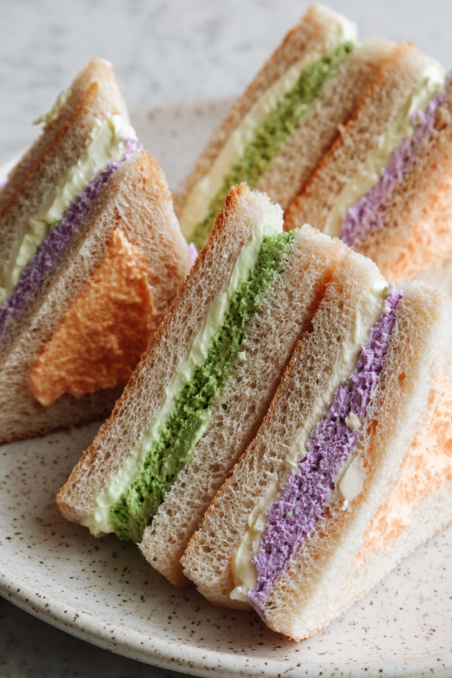 These Easy Colorful Tea Sandwiches are a vibrant and healthy snack featuring layers of creamy avocado cilantro dressing, tangy yogurt mixed with finely chopped carrots and purple cabbage, all stacked between slices of wholegrain or rye bread. Perfect for tea-time or as a light appetizer, these sandwiches combine fresh vegetables, flavorful spreads, and soft bread to create a visually appealing and delicious treat.