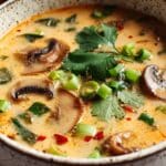 This Irresistibly Creamy Thai Coconut Soup (Tom Kha) is a flavorful and comforting Thai classic that comes together in just 25 minutes. Featuring a harmonious blend of creamy coconut milk, fresh ginger, lemongrass, and spicy chili paste, this soup is perfect for a quick weeknight meal or a cozy dinner. You can easily make it vegan by substituting chicken stock and protein with vegetable stock and tofu.