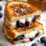 This Crispy Blueberry Grilled Cheese combines the sweet and tangy flavors of homemade blueberry lemon thyme jam with melted mozzarella and white cheddar cheeses. The sandwich is pan-grilled to golden perfection, creating a delightful contrast of crispy bread and gooey cheese, elevated by a sprinkle of flaky sea salt and fresh lemon thyme.