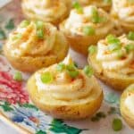 Delicious and creamy deviled potatoes made by boiling baby potatoes, scooping out their centers, and mixing the filling with mayonnaise, mustard, and pickle juice. This easy appetizer is garnished with paprika and green onions, perfect for parties or a tasty snack.