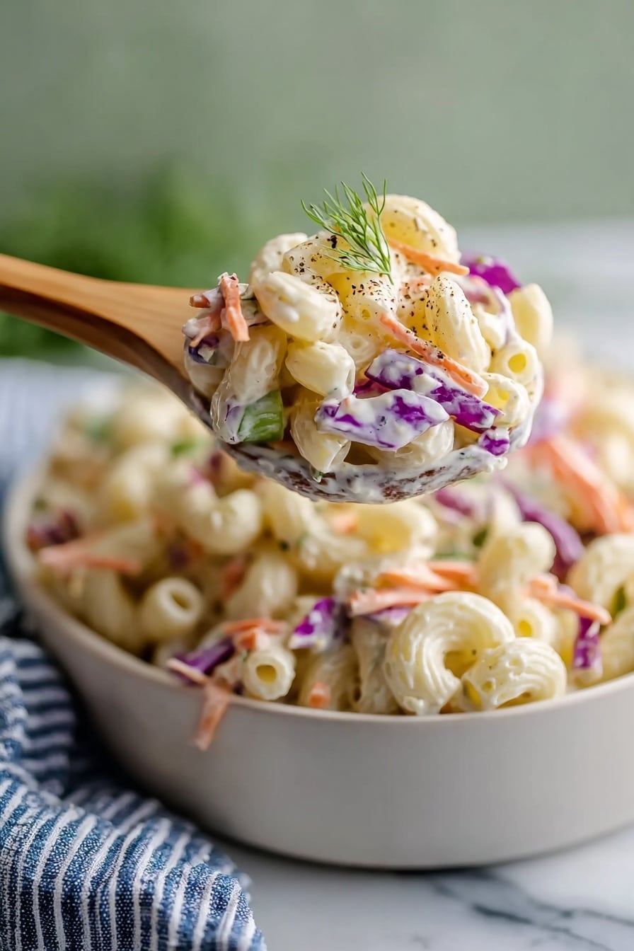 Whisk together the mayo, Dijon, cider vinegar, sugar, salt, grated onion, celery seeds, and black pepper until smooth and glossy. Toss the cooled pasta into the dressing bowl, ensuring every piece is luxuriously coated. Then fold in the coleslaw mix gently to preserve the crispy texture of the veggies. Resist the urge to stir wildly-folding keeps everything looking fresh and colored. Once combined, taste and tweak the seasoning with a pinch more salt or vinegar if you want it brighter. Let the salad rest in the fridge for at least 30 minutes to let the flavors meld-the slight softening of cabbage transforms this into a truly harmonious dish. It's ready when the dressing feels silky and each bite shines with tangy, creamy goodness.