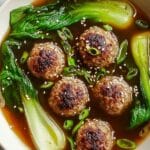 This Ginger Chicken Meatball Soup with Bok Choy is a comforting and flavorful dish perfect for cozy nights. Featuring tender baked chicken meatballs infused with fresh ginger, garlic, and sesame oil, simmered in a savory broth with baby bok choy and optional noodles, this soup offers a perfect balance of warmth and nutrition. Crispy fried wonton strips add a delightful crunch to each bowl, enhancing the comforting experience.