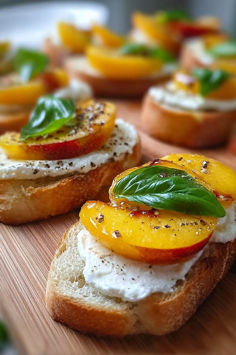 Use a long wooden board or a bright platter to showcase the golden crostini lined in an inviting row. Add height by slightly stacking crostini or layering peach slices elegantly. Keep edges clean and wipe away any stray balsamic drips. For photography, natural light and a simple backdrop with fresh basil sprigs nearby create an inviting, homey vibe that captures the recipe's gentle charm and vibrant colors.