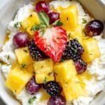 A refreshing and nutritious Cottage Cheese and Fruit Salad combining creamy cottage cheese with sweet pineapple, juicy grapes, and mixed berries, lightly drizzled with honey for a perfect balance of flavors. This quick no-cook recipe is ideal for a healthy snack or light meal.