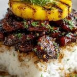This Hawaiian Huli Huli Chicken Stack features tender grilled chicken marinated in a flavorful blend of teriyaki, pineapple juice, and ginger, topped with caramelized pineapple rings and served on a bed of steamed white rice. Finished with a glossy homemade glaze and garnished with green onions and sesame seeds, this dish brings a delicious tropical twist perfect for weeknight dinners or entertaining.