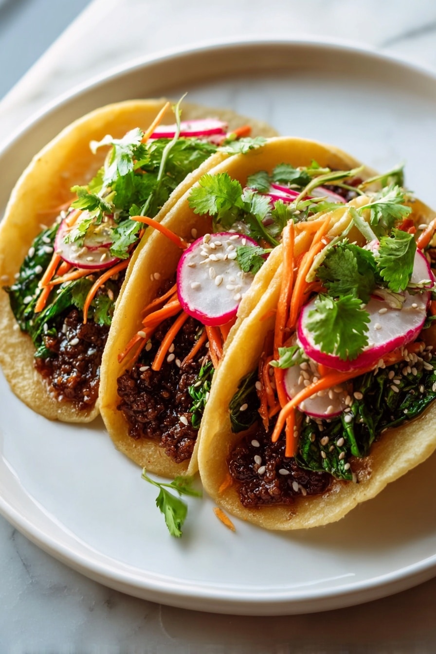Fresh sliced green onions bring a vivid pop of color and gentle onion bite that feels like a fresh herbal lift. The warm tortillas provide a tender, buttery base to hold all those vibrant layers, while creamy gochujang mayo adds richness and just a touch of heat that complements the tangy kimchi and crisp pickles beautifully. Toasted sesame seeds sprinkle a nutty crunch and a delicate golden shimmer. If you like, squeeze a wedge of lime over your tacos just before digging in-it brightens all those flavors perfectly.