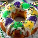 This traditional King Cake recipe features a soft, rich dough filled with a buttery cinnamon sugar mixture, baked to golden perfection, then topped with a creamy glaze and vibrant purple, green, and gold sprinkles. Perfect for festive celebrations, this cake offers a classic New Orleans treat with a braided ring shape symbolizing unity and festivity.