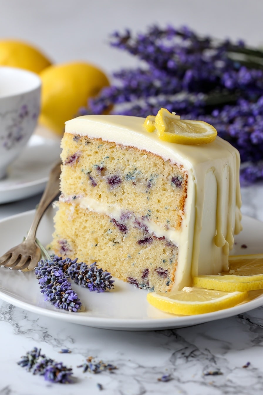 - Decorate and Rest: Garnish the frosted cake with fresh lavender sprigs and lemon slices for a beautiful presentation. Allow the cake to sit for 30 minutes so the flavors meld together before slicing and serving.
