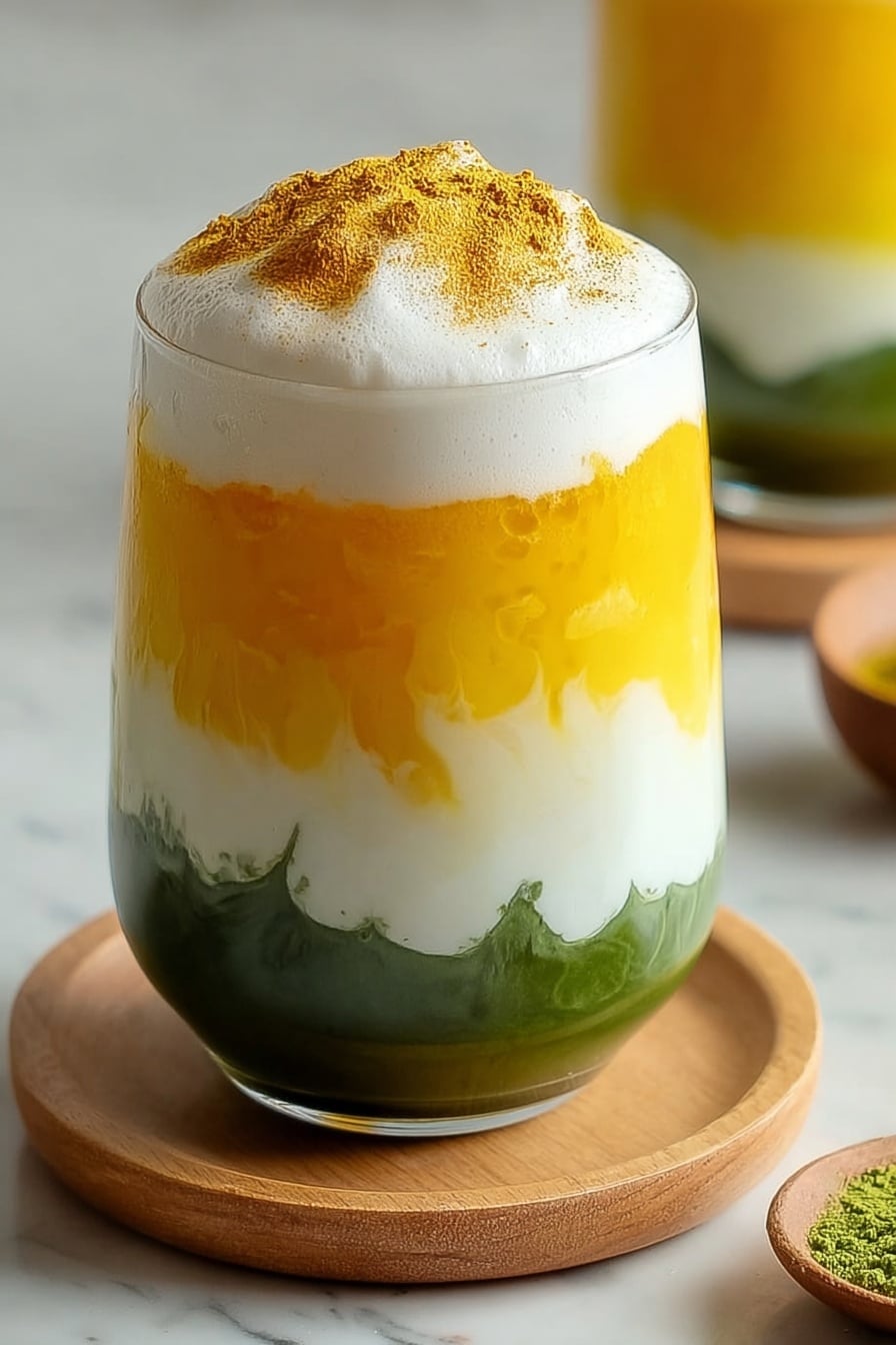 Layer your latte in the glass: start with your mango puree at the bottom, then add ice cubes to about halfway up, followed by the remaining almond milk. Finally, gently pour the whisked matcha over the top for a stunning visual swirl of green over gold. If you like, drizzle honey or maple syrup and sprinkle a tiny pinch of sea salt to coax out those flavors. Give it a gentle stir just before sipping-your perfect Mango Matcha Iced Latte Recipe is ready.