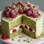 This Pistachio Raspberry Cake is a delightful celebration of flavor and color, featuring a moist pistachio-infused sponge layered with luscious buttercream and tangy raspberry jam. Topped with fresh raspberries, chopped pistachios, and mint sprigs, this cake offers a perfect balance of nutty, sweet, and fruity notes, making it an elegant treat for any special occasion.