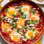 Shakshuka is a flavorful Middle Eastern and North African dish featuring eggs poached in a rich, spiced tomato sauce with bell peppers and onions. Perfect for breakfast, brunch, or a hearty dinner, this skillet-cooked recipe combines smoky paprika, cumin, and optional cayenne for a mildly spicy kick, topped with fresh cilantro and creamy feta cheese. Served with warm pita bread, it's a satisfying and colorful one-pan meal.