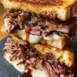 This recipe for BBQ Brisket Melts features tender, slow-smoked brisket layered with crispy fried onions and melted cheeses on toasted sourdough bread. The brisket is seasoned with a pepper-forward rub and slow-smoked over hickory wood pellets, then wrapped and cooked to perfection before being assembled into savory, cheesy melts. The combination of smoky meat, caramelized onions, and toasted bread creates an indulgent sandwich perfect for a hearty meal.