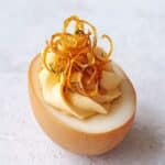 Soy Sauce Ramen Deviled Eggs are a flavorful twist on classic deviled eggs, featuring marinated egg whites infused with soy sauce and a rich filling made from egg yolks mixed with Japanese mayonnaise, ramen seasoning, rice vinegar, and sugar. The dish is topped with crispy soy sauce-seasoned ramen noodles and garnished with Furikake for a crunchy, umami-packed appetizer or snack.