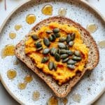 This Spiced Pumpkin and Cream Cheese Toast is a delicious and easy breakfast or snack option that combines the warm flavors of pumpkin pie spice with creamy cream cheese and sweet maple syrup, all atop crunchy whole wheat toast. Finished with a sprinkle of crunchy pumpkin seeds, this dish offers a perfect balance of sweetness, spice, and texture.