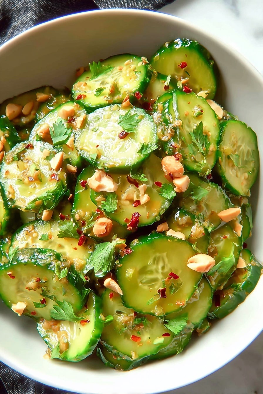 After your cucumbers have released their water and feel supple but still firm, transfer them to a fresh bowl to avoid any residual liquid. Add the toasted chopped peanuts and fresh parsley now-go ahead and give everything a gentle toss to coat each cucumber slice thoroughly with that luscious, spicy peanut dressing. You'll know it's ready when you see a glossy sheen on every piece and can smell the fresh herbs mingling with the nutty, spicy aroma. Serve immediately to enjoy the peak freshness and satisfying crunch. If prepping ahead, refrigerate for up to 8 hours-just toss again before serving to redistribute the dressing and wake up the flavors.