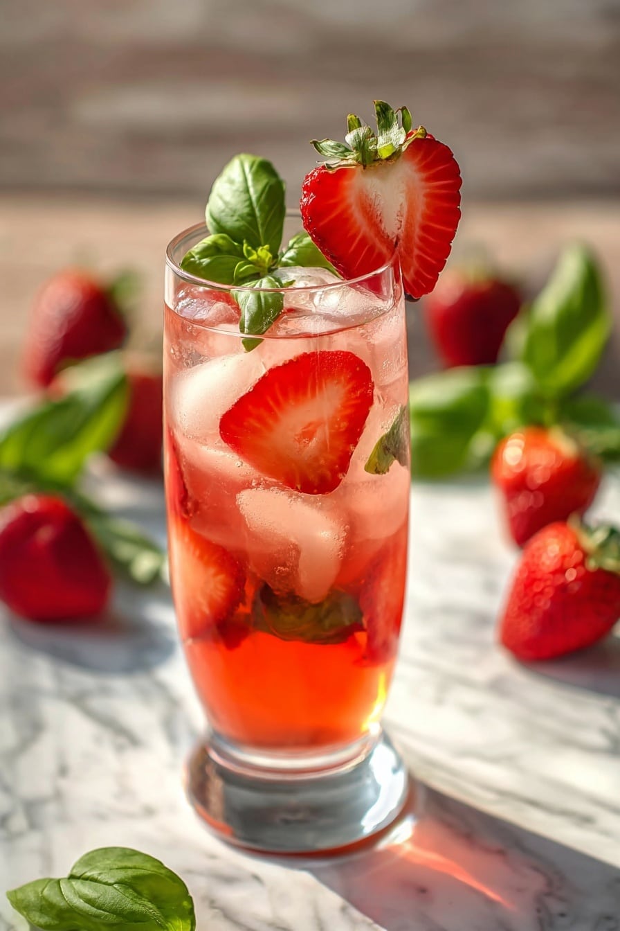 - Garnish and Serve: Top the mocktail with additional basil leaves and a strawberry slice for an attractive presentation. Serve immediately with a straw or stirring stick to enjoy fresh.