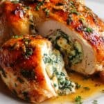 This copycat recipe for Ruth’s Chris Stuffed Chicken features tender chicken breasts stuffed with a creamy mixture of cream cheese, fresh spinach, and mozzarella, seasoned with garlic and Italian herbs. The chicken is seared to golden perfection and then baked with a flavorful broth and lemon juice, finished with a sprinkle of Parmesan cheese for an irresistible dish that’s perfect for a cozy dinner.