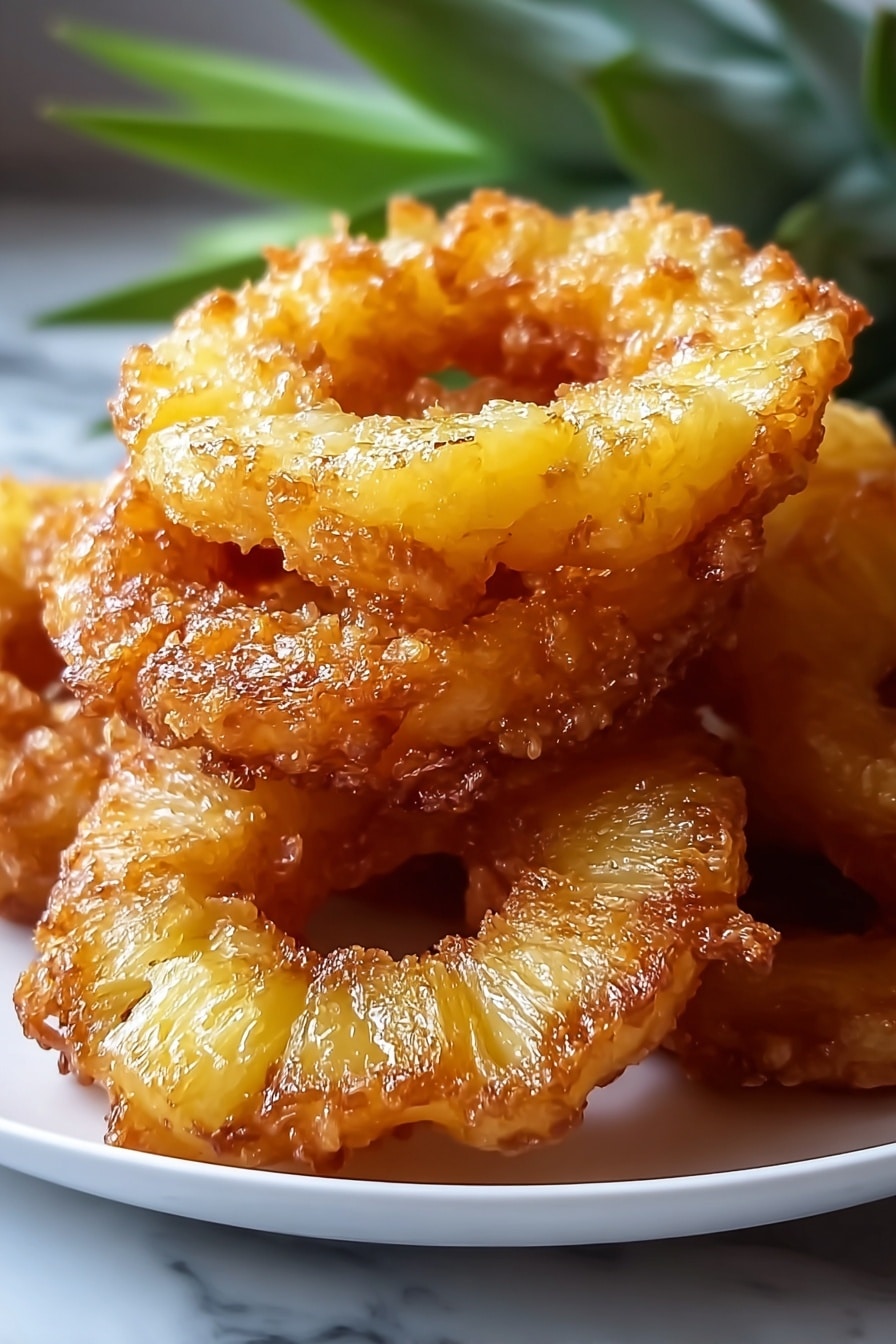 Heat vegetable oil to a steady 375°F (190°C) for that perfect sizzle. Maintaining temperature ensures your fritters get that golden crisp without absorbing too much oil. Dip each pineapple ring into the batter, letting excess drip back into the bowl gently. Place your coated pineapple rings into the hot oil carefully-work in batches to avoid crowding. Fry about 2 minutes per side, watching for that gorgeous golden-brown hue and the enticing aroma filling your kitchen. This stage is fun-the gentle sizzle and visual cue of crisp edges are very satisfying.